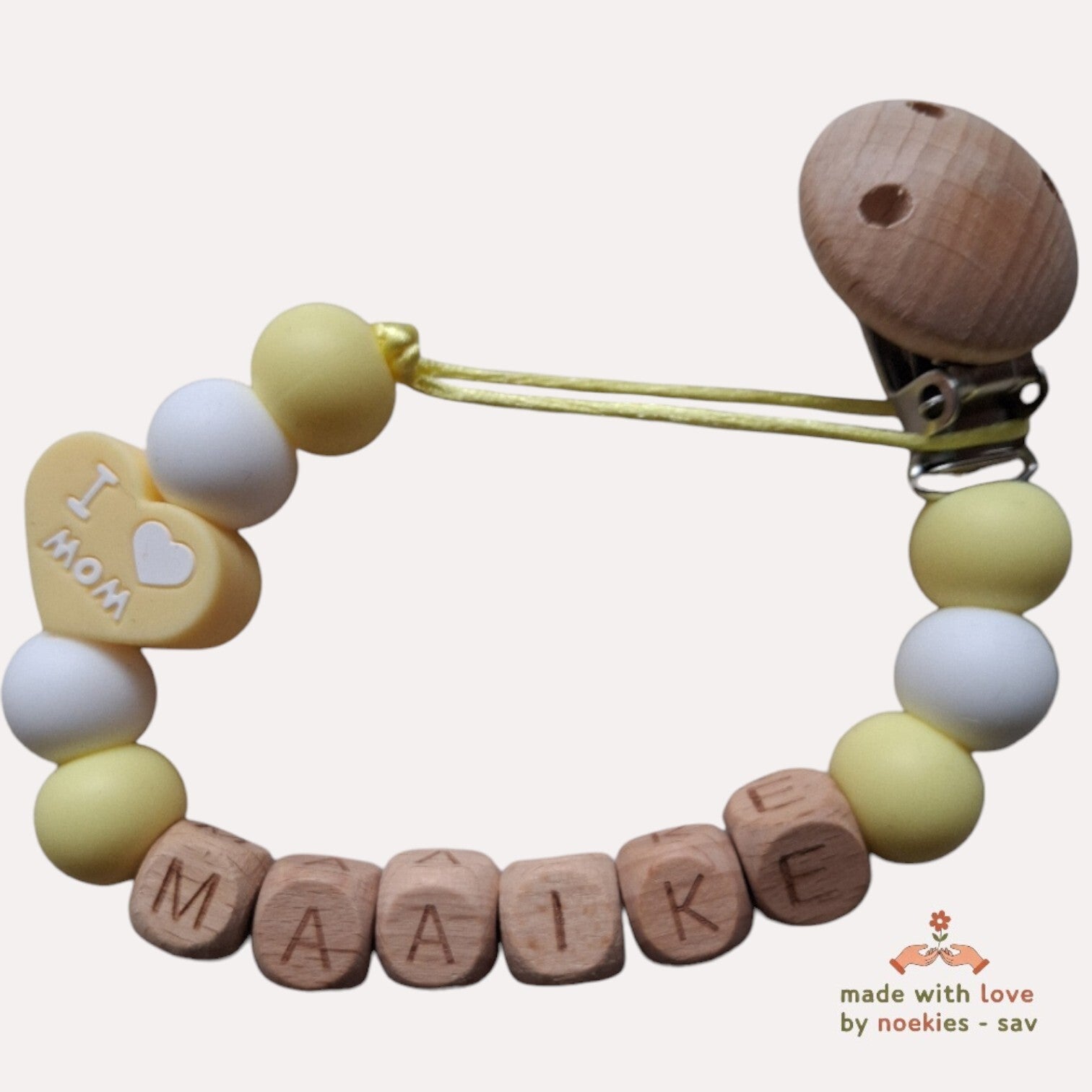 Met welke naam mogen wij aan de slag? Met deze op naam gemaakte speenkoord, raakt je kleintje zijn of haar speentje niet meer kwijt.