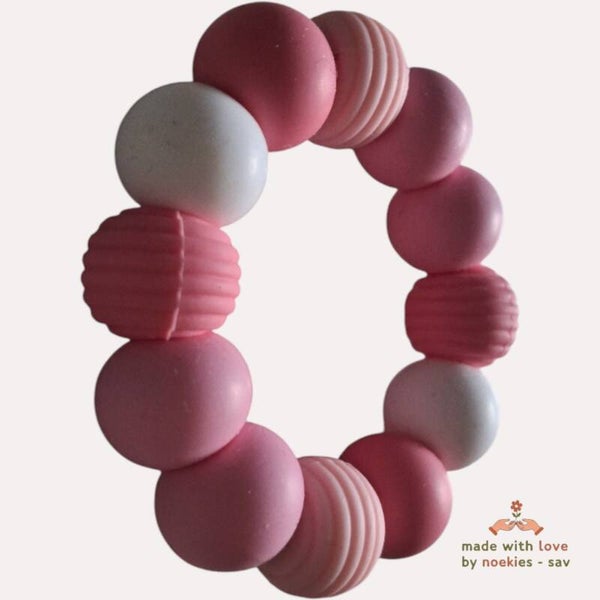 Handgemaakt. Kleuren wit lichtroze donkerroze. Wanneer je baby tandjes krijgttussen de 4 en 7 maanden, zorgt dit vaak voor pijn en ongemak bij je baby. Het is een nieuw en onprettig gevoel waaraan hij of zij moet wennen. Sabbelen en bijten op een bijtring kan hem of haar hierbij helpen. De tegendruk die dit op zijn tandvlees geeft, verlicht de pijn. Ook kan een bijtring ervoor zorgen dat de tanden sneller doorkomen. Noekies .com kan niet aansprakelijk worden gesteld voor enige schade, letsel of ongelukken die voortvloeien uit het gebruik van de artikelen.