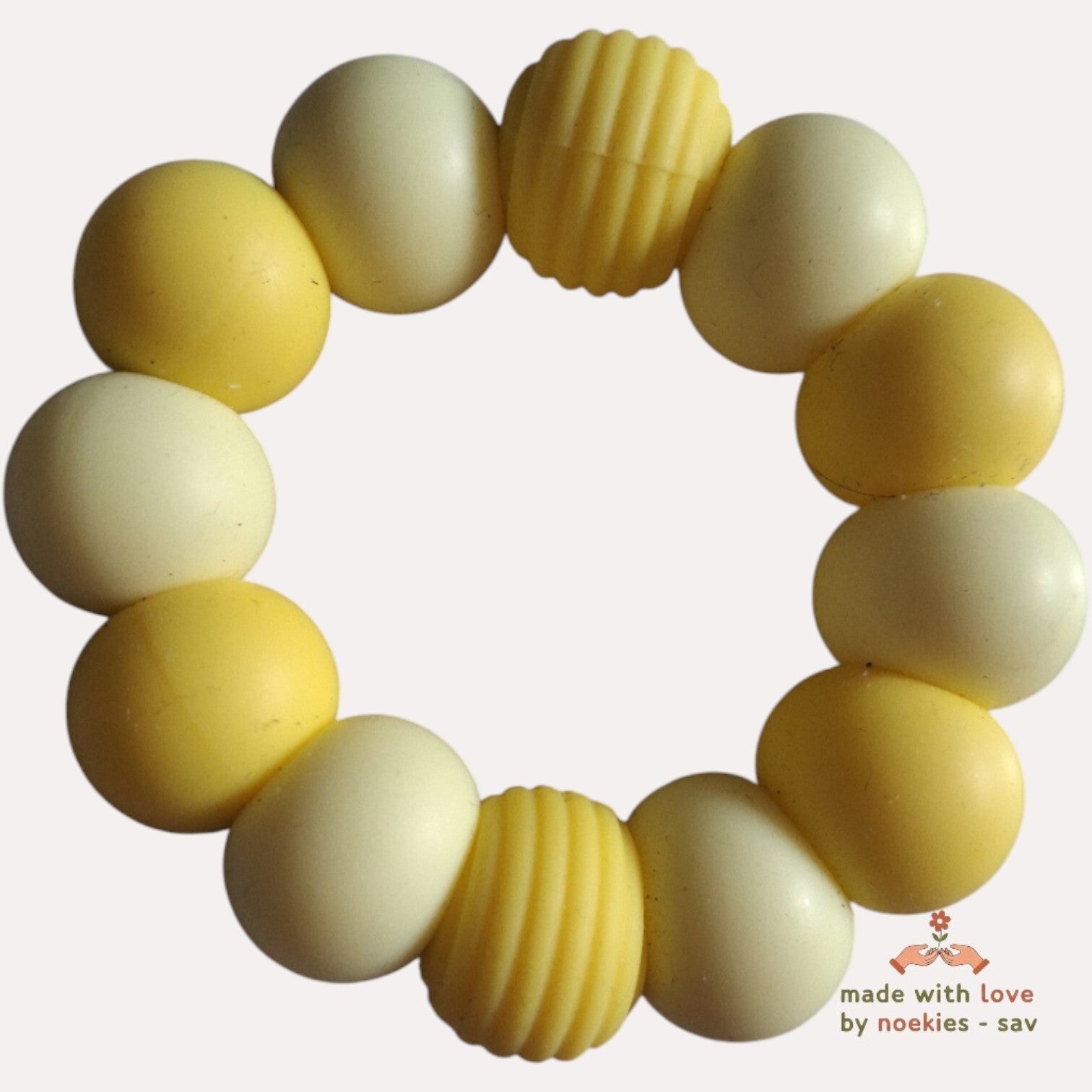 Handgemaakt. Kleuren geel lichtgeel. Wanneer je baby tandjes krijgttussen de 4 en 7 maanden, zorgt dit vaak voor pijn en ongemak bij je baby. Het is een nieuw en onprettig gevoel waaraan hij of zij moet wennen. Sabbelen en bijten op een bijtring kan hem of haar hierbij helpen. De tegendruk die dit op zijn tandvlees geeft, verlicht de pijn. Ook kan een bijtring ervoor zorgen dat de tanden sneller doorkomen. Noekies .com kan niet aansprakelijk worden gesteld voor enige schade, letsel of ongelukken die voortvloeien uit het gebruik van de artikelen.