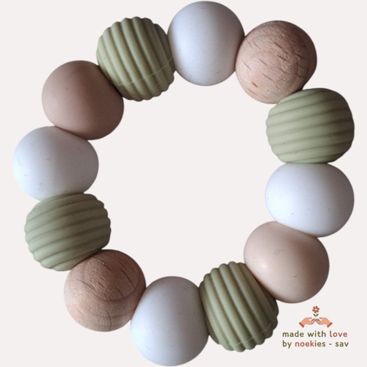 Handgemaakt. Kleuren khaki groen beige wit. Wanneer je baby tandjes krijgttussen de 4 en 7 maanden, zorgt dit vaak voor pijn en ongemak bij je baby. Het is een nieuw en onprettig gevoel waaraan hij of zij moet wennen. Sabbelen en bijten op een bijtring kan hem of haar hierbij helpen. De tegendruk die dit op zijn tandvlees geeft, verlicht de pijn. Ook kan een bijtring ervoor zorgen dat de tanden sneller doorkomen. Noekies .com kan niet aansprakelijk worden gesteld voor enige schade, letsel of ongelukken die voortvloeien uit het gebruik van de artikelen.