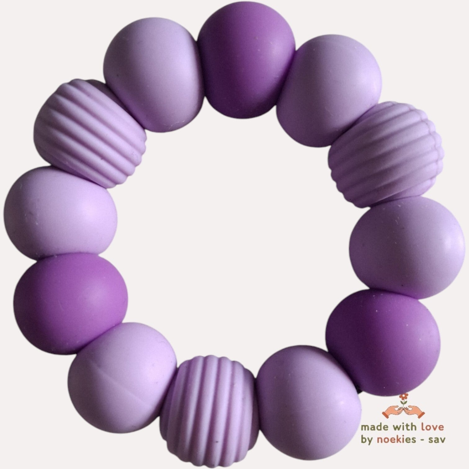 Handgemaakt. Kleuren lila paars. Wanneer je baby tandjes krijgttussen de 4 en 7 maanden, zorgt dit vaak voor pijn en ongemak bij je baby. Het is een nieuw en onprettig gevoel waaraan hij of zij moet wennen. Sabbelen en bijten op een bijtring kan hem of haar hierbij helpen. De tegendruk die dit op zijn tandvlees geeft, verlicht de pijn. Ook kan een bijtring ervoor zorgen dat de tanden sneller doorkomen. Noekies .com kan niet aansprakelijk worden gesteld voor enige schade, letsel of ongelukken die voortvloeien uit het gebruik van de artikelen.