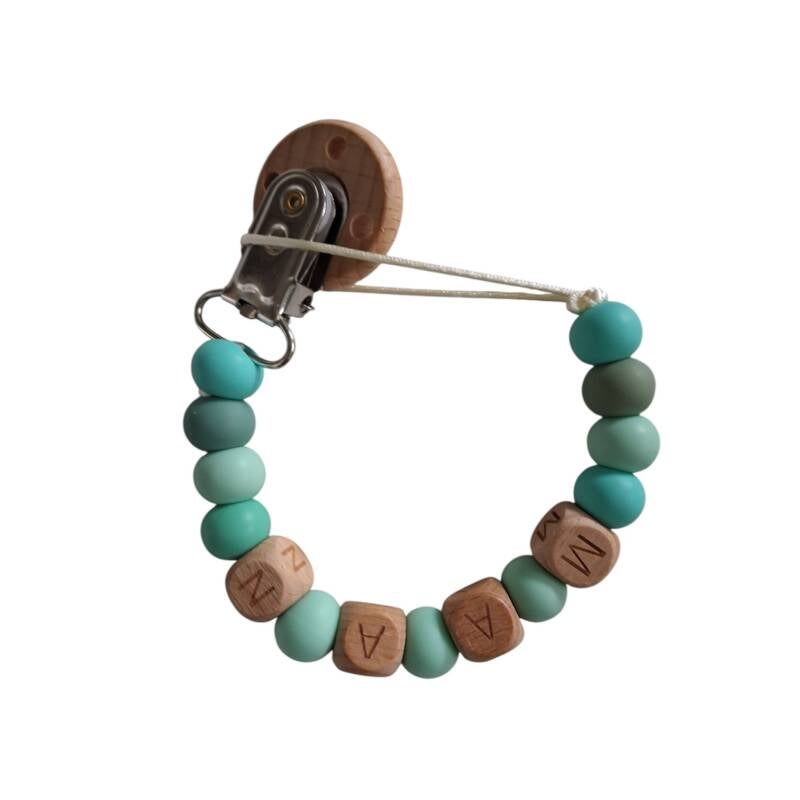 Handgemaakt. Welke naam is voor jou wondertje? Nadat de bestelling voltooid is , ontvangt u een berichtje van mij, welke naam u wenst. En gaan we met liefde aan de slag! De siliconen kralen zijn een mix van turquoise, mintgroene en kleigroene kleuren. De letterkralen zijn van beukenhout. De kralen zijn volledig BPA-vrij, PVC-vrij, lood-vrij en ftalaat-vrij. Met deze op naam gemaakte speenkoord, raakt je kleintje zijn of haar speentje niet meer kwijt. De handige stevige klip is bedoeld voor aan de kledingstukken die je kind draagt, autostoelgordel, kinderwagen. Voor zowel thuis gebruik als voor onderweg. Erg leuk om cadeau te geven. Niet geschikt als speelgoed of bijtring. Laat je kleintje nooit alleen ermee. Nooit meer het favoriete speentje kwijtraken door zo'n handig speenkoord. Het speentje kan ook niet meer op de grond vallen. Hygiënisch, hip en gepersonaliseerd met naam! Als de naam langer dan 5 letters is (max 9 letters) kan er een aanpassing aan het speenkoord gemaakt worden. Speenkoorden mogen volgends NEN12586 veiligheidnorm, inclusief lus, zonder clip, maximaal 22 cm lang zijn. Noekies .com kan niet aansprakelijk worden gesteld voor enige schade, letsel of ongelukken die voortvloeien uit het gebruik van dit speenkoord, zowel direct als indirect. Een speenkoord Is niet bedoeld om op te bijten. Het gebruik van een speenkoord is op eigen verantwoordelijkheid.