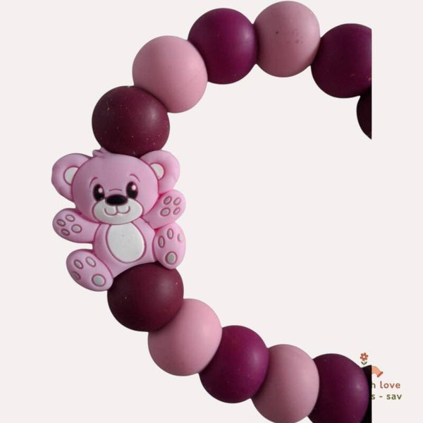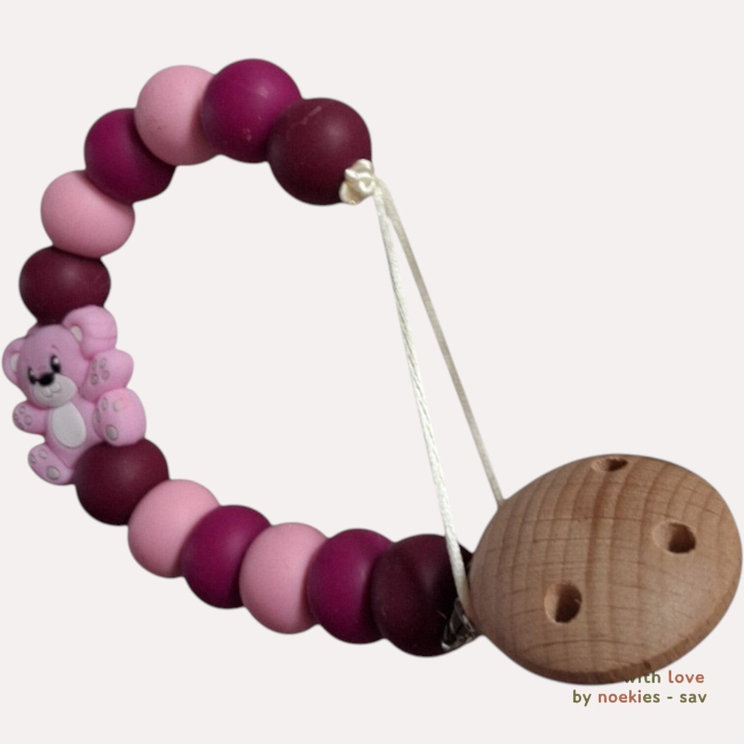 Handgemaakt. Thema Beertje. Speen koord met beertje in de kleuren roze, paars, wijnrood. Met deze speenkoord, raakt je kleintje zijn of haar speentje niet meer kwijt. De handige stevige klip is bedoeld voor aan de kledingstukken die je kind draagt, autostoelgordel, kinderwagen. Voor zowel thuis gebruik als voor onderweg. Totale lengte 28cm. Erg leuk om cadeau te geven. Niet geschikt als speelgoed of bijtring. Laat je kleintje nooit alleen ermee. Het speentje kan ook niet meer op de grond vallen. Speenkoorden mogen volgends NEN12586 veiligheidnorm, inclusief lus, zonder clip, maximaal 22 cm lang zijn. - Noekies .com kan niet aansprakelijk worden gesteld voor enige schade, letsel of ongelukken die voortvloeien uit het gebruik van dit speenkoord, zowel direct als indirect. Een speenkoord Is niet bedoeld om op te bijten. Het gebruik van een speenkoord is op eigen verantwoordelijkheid.