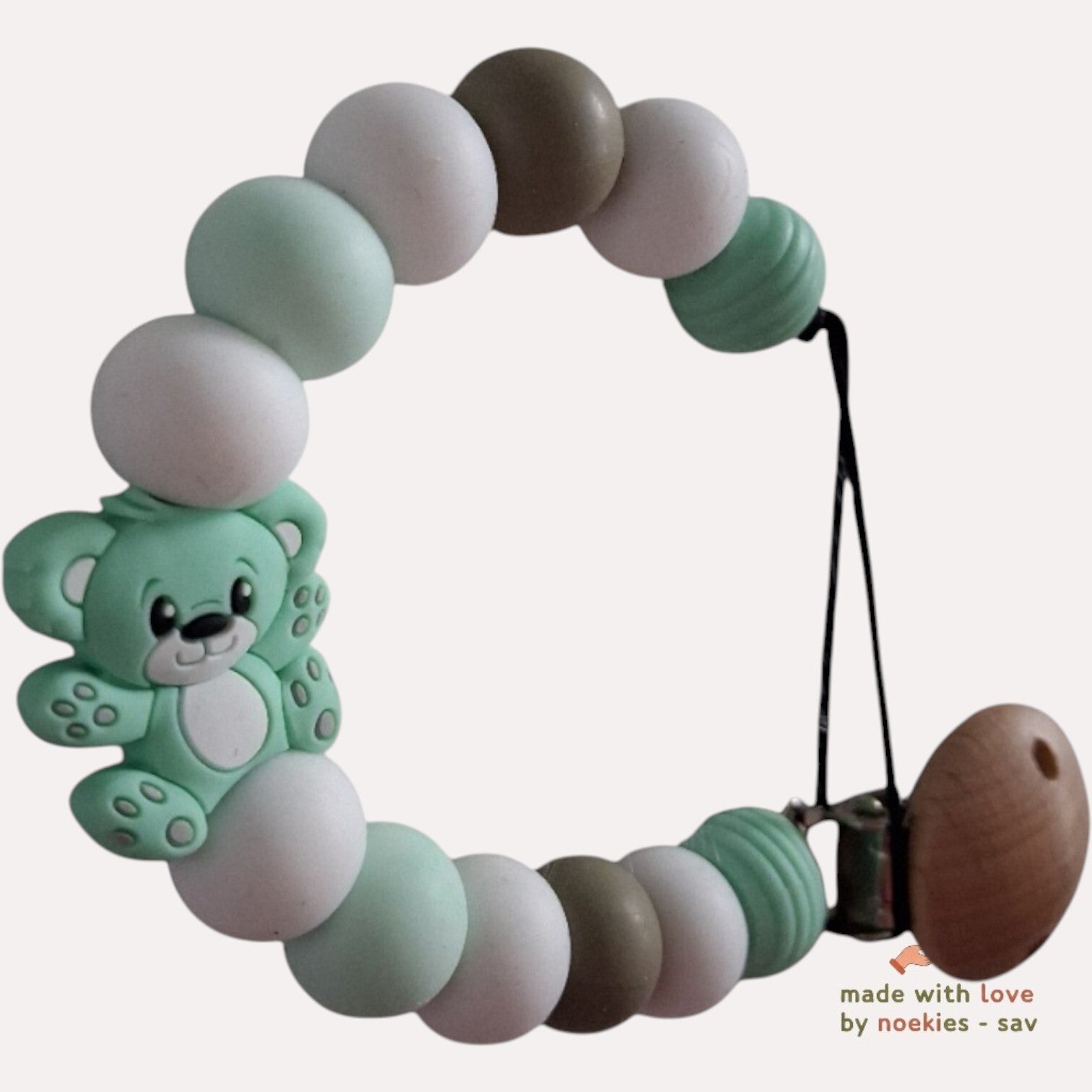 Handgemaakt. Thema Beertje. Speen koord met beertje in de kleuren mintgroen, wit en khaki. Met deze speenkoord, raakt je kleintje zijn of haar speentje niet meer kwijt. De handige stevige klip is bedoeld voor aan de kledingstukken die je kind draagt, autostoelgordel, kinderwagen. Voor zowel thuis gebruik als voor onderweg. Totale lengte 28cm. Erg leuk om cadeau te geven. Niet geschikt als speelgoed of bijtring. Laat je kleintje nooit alleen ermee. Het speentje kan ook niet meer op de grond vallen. Speenkoorden mogen volgends NEN12586 veiligheidnorm, inclusief lus, zonder clip, maximaal 22 cm lang zijn. - Noekies .com kan niet aansprakelijk worden gesteld voor enige schade, letsel of ongelukken die voortvloeien uit het gebruik van dit speenkoord, zowel direct als indirect. Een speenkoord Is niet bedoeld om op te bijten. Het gebruik van een speenkoord is op eigen verantwoordelijkheid.