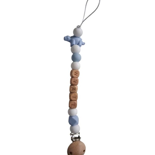 Handgemaakt. Welke naam is voor jou wondertje? Nadat de bestelling voltooid is , ontvangt u een berichtje van mij, welke naam u wenst. En gaan we met liefde aan de slag! De siliconen kralen zijn een mix van wit en lichtblauwe kleuren met vrolijk dino stekel. De letterkralen zijn van beukenhout. De kralen zijn volledig BPA-vrij, PVC-vrij, lood-vrij en ftalaat-vrij. Met deze op naam gemaakte speenkoord, raakt je kleintje zijn of haar speentje niet meer kwijt. De handige stevige klip is bedoeld voor aan de kledingstukken die je kind draagt, autostoelgordel, kinderwagen. Voor zowel thuis gebruik als voor onderweg. Erg leuk om cadeau te geven. Niet geschikt als speelgoed of bijtring. Laat je kleintje nooit alleen ermee. Nooit meer het favoriete speentje kwijtraken door zo'n handig speenkoord. Het speentje kan ook niet meer op de grond vallen. Hygiënisch, hip en gepersonaliseerd met naam! Als de naam langer dan 5 letters is (max 9 letters) kan er een aanpassing aan het speenkoord gemaakt worden. Speenkoorden mogen volgends NEN12586 veiligheidnorm, inclusief lus, zonder clip, maximaal 22 cm lang zijn. Noekies .com kan niet aansprakelijk worden gesteld voor enige schade, letsel of ongelukken die voortvloeien uit het gebruik van dit speenkoord, zowel direct als indirect. Een speenkoord Is niet bedoeld om op te bijten. Het gebruik van een speenkoord is op eigen verantwoordelijkheid.