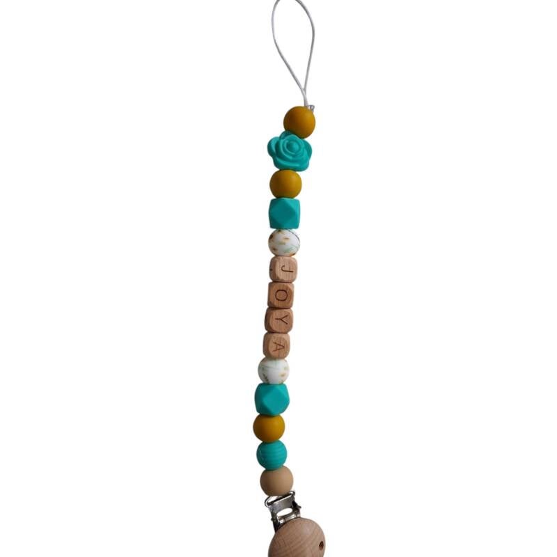noekies handgemaakte naam speenkoord roos bloemetje turquoise mosterdgeel