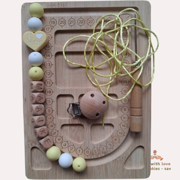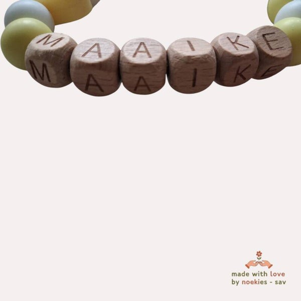 Handgemaakt. Welke naam is voor jou wondertje? Nadat de bestelling voltooid is , ontvangt u een berichtje van mij, welke naam u wenst. En gaan we met liefde aan de slag! De siliconen kralen zijn een mix van lichtgele en witte kleuren met geel hartje aan de ene kant i love mom en aan de andere kan i love dad. De letterkralen zijn van beukenhout. De kralen zijn volledig BPA-vrij, PVC-vrij, lood-vrij en ftalaat-vrij. Met deze op naam gemaakte speenkoord, raakt je kleintje zijn of haar speentje niet meer kwijt. De handige stevige klip is bedoeld voor aan de kledingstukken die je kind draagt, autostoelgordel, kinderwagen. Voor zowel thuis gebruik als voor onderweg. Erg leuk om cadeau te geven. Niet geschikt als speelgoed of bijtring. Laat je kleintje nooit alleen ermee. Nooit meer het favoriete speentje kwijtraken door zo'n handig speenkoord. Het speentje kan ook niet meer op de grond vallen. Hygiënisch, hip en gepersonaliseerd met naam! Als de naam langer dan 5 letters is (max 9 letters) kan er een aanpassing aan het speenkoord gemaakt worden. Speenkoorden mogen volgends NEN12586 veiligheidnorm, inclusief lus, zonder clip, maximaal 22 cm lang zijn. Noekies .com kan niet aansprakelijk worden gesteld voor enige schade, letsel of ongelukken die voortvloeien uit het gebruik van dit speenkoord, zowel direct als indirect. Een speenkoord Is niet bedoeld om op te bijten. Het gebruik van een speenkoord is op eigen verantwoordelijkheid.