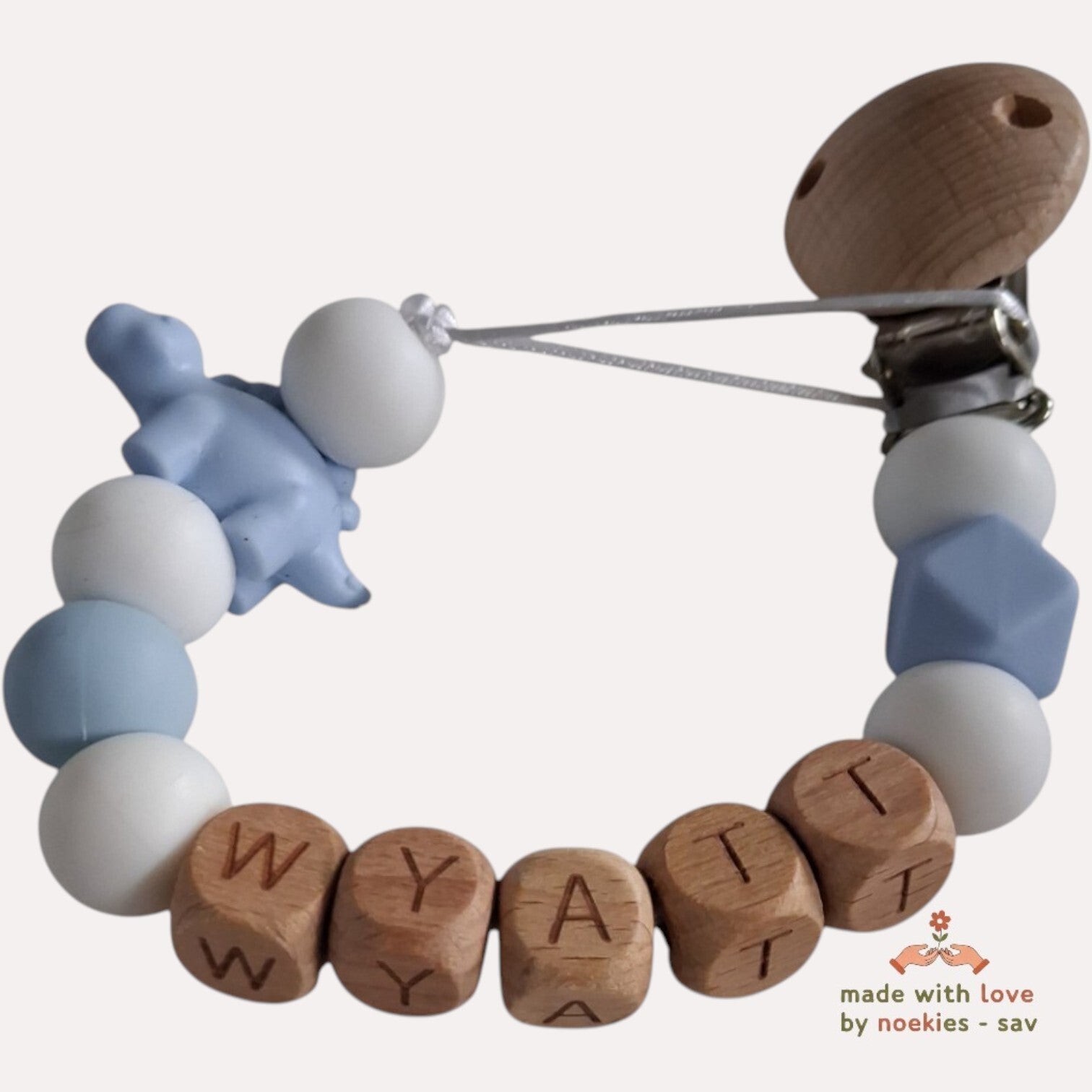 Handgemaakt. Welke naam is voor jou wondertje? Nadat de bestelling voltooid is , ontvangt u een berichtje van mij, welke naam u wenst. En gaan we met liefde aan de slag! De siliconen kralen zijn een mix van wit en lichtblauwe kleuren met vrolijk dino stekel. De letterkralen zijn van beukenhout. De kralen zijn volledig BPA-vrij, PVC-vrij, lood-vrij en ftalaat-vrij. Met deze op naam gemaakte speenkoord, raakt je kleintje zijn of haar speentje niet meer kwijt. De handige stevige klip is bedoeld voor aan de kledingstukken die je kind draagt, autostoelgordel, kinderwagen. Voor zowel thuis gebruik als voor onderweg. Erg leuk om cadeau te geven. Niet geschikt als speelgoed of bijtring. Laat je kleintje nooit alleen ermee. Nooit meer het favoriete speentje kwijtraken door zo'n handig speenkoord. Het speentje kan ook niet meer op de grond vallen. Hygiënisch, hip en gepersonaliseerd met naam! Als de naam langer dan 5 letters is (max 9 letters) kan er een aanpassing aan het speenkoord gemaakt worden. Speenkoorden mogen volgends NEN12586 veiligheidnorm, inclusief lus, zonder clip, maximaal 22 cm lang zijn. Noekies .com kan niet aansprakelijk worden gesteld voor enige schade, letsel of ongelukken die voortvloeien uit het gebruik van dit speenkoord, zowel direct als indirect. Een speenkoord Is niet bedoeld om op te bijten. Het gebruik van een speenkoord is op eigen verantwoordelijkheid.