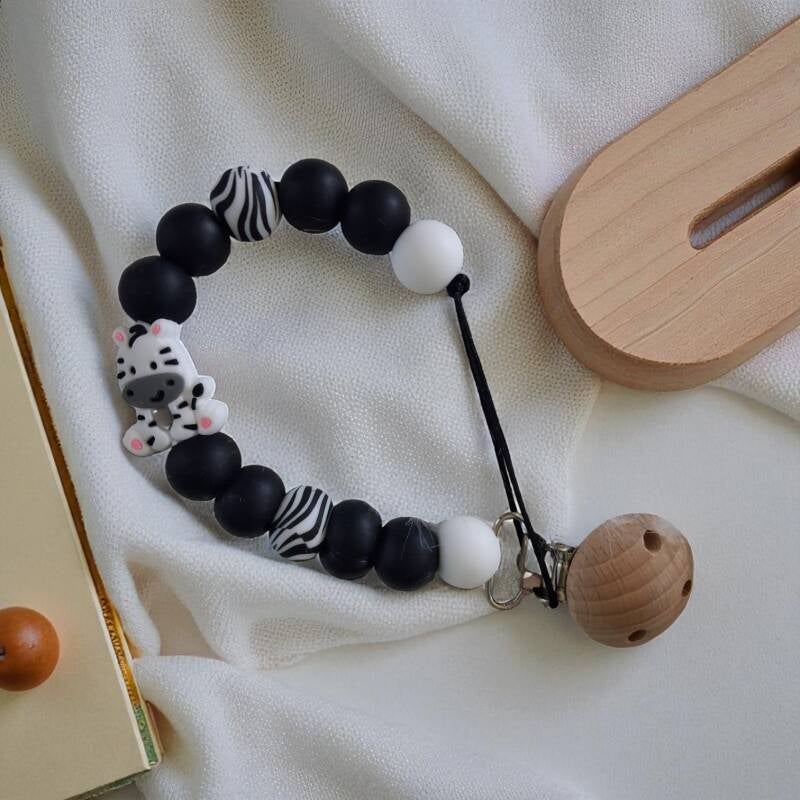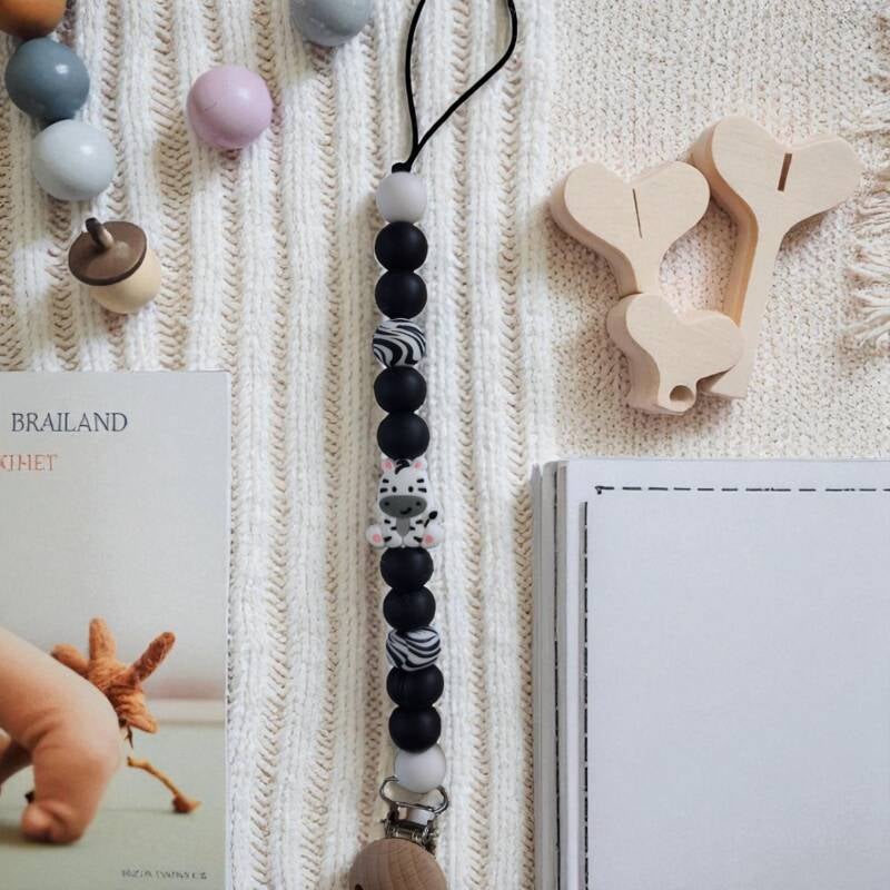 Handgemaakt. Thema zebra. Speenkoord met zebra in de kleuren zwart roze en wit. Met deze speenkoord, raakt je kleintje zijn of haar speentje niet meer kwijt. De handige stevige klip is bedoeld voor aan de kledingstukken die je kind draagt, autostoelgordel, kinderwagen. Voor zowel thuis gebruik als voor onderweg. Totale lengte 28cm. Erg leuk om cadeau te geven. Niet geschikt als speelgoed of bijtring. Laat je kleintje nooit alleen ermee. Het speentje kan ook niet meer op de grond vallen. Hygiënisch, hip en gepersonaliseerd met naam! Speenkoorden mogen volgends NEN12586 veiligheidnorm, inclusief lus, zonder clip, maximaal 22 cm lang zijn. - Noekies .com kan niet aansprakelijk worden gesteld voor enige schade, letsel of ongelukken die voortvloeien uit het gebruik van dit speenkoord, zowel direct als indirect. Een speenkoord Is niet bedoeld om op te bijten. Het gebruik van een speenkoord is op eigen verantwoordelijkheid.