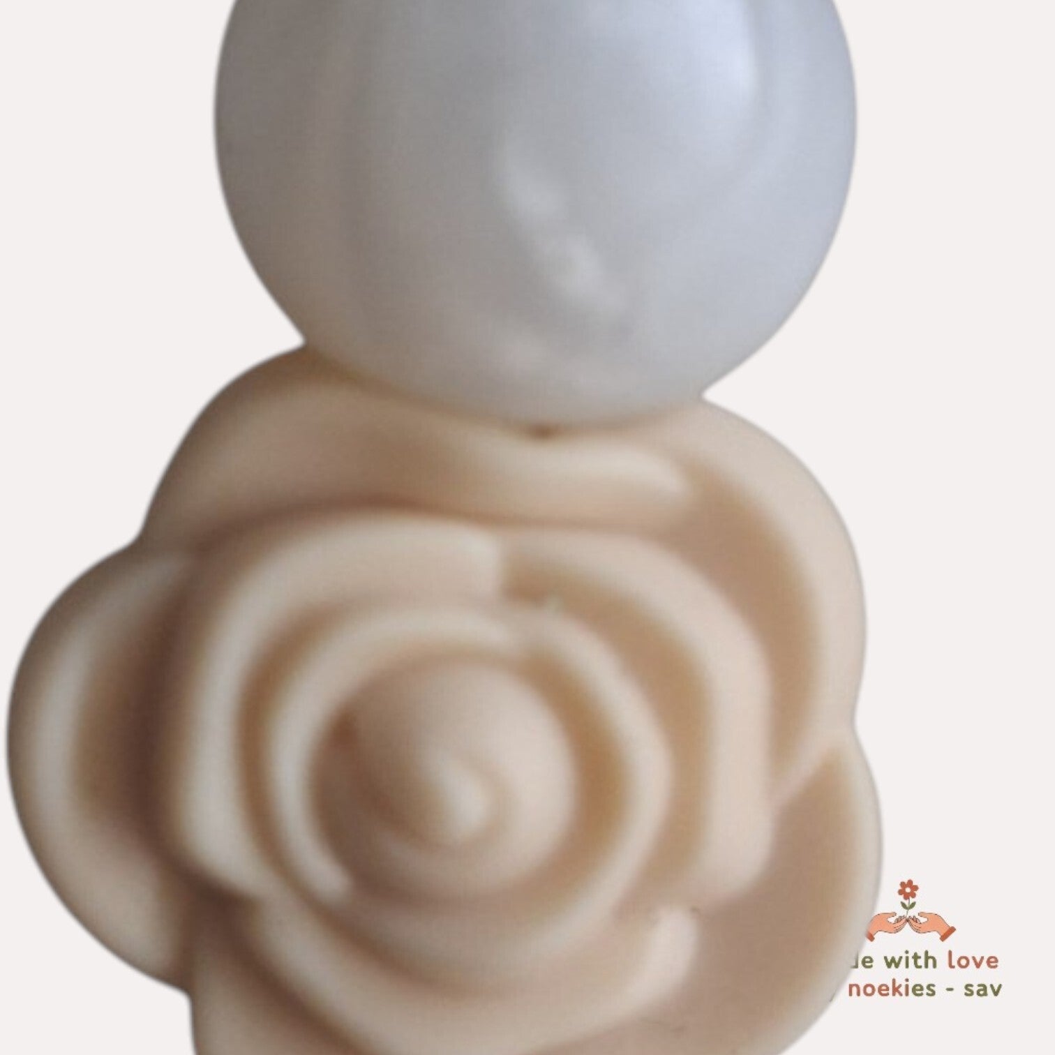 Handgemaakt. Thema roos. Speen koord metbeige roosje in de kleuren grijs, beige, wit en parelmoer wit. Met deze speenkoord, raakt je kleintje zijn of haar speentje niet meer kwijt. De handige stevige klip is bedoeld voor aan de kledingstukken die je kind draagt, autostoelgordel, kinderwagen. Voor zowel thuis gebruik als voor onderweg. Totale lengte 28cm. Erg leuk om cadeau te geven. Niet geschikt als speelgoed of bijtring. Laat je kleintje nooit alleen ermee. Het speentje kan ook niet meer op de grond vallen. Speenkoorden mogen volgends NEN12586 veiligheidnorm, inclusief lus, zonder clip, maximaal 22 cm lang zijn. - Noekies .com kan niet aansprakelijk worden gesteld voor enige schade, letsel of ongelukken die voortvloeien uit het gebruik van dit speenkoord, zowel direct als indirect. Een speenkoord Is niet bedoeld om op te bijten. Het gebruik van een speenkoord is op eigen verantwoordelijkheid.
