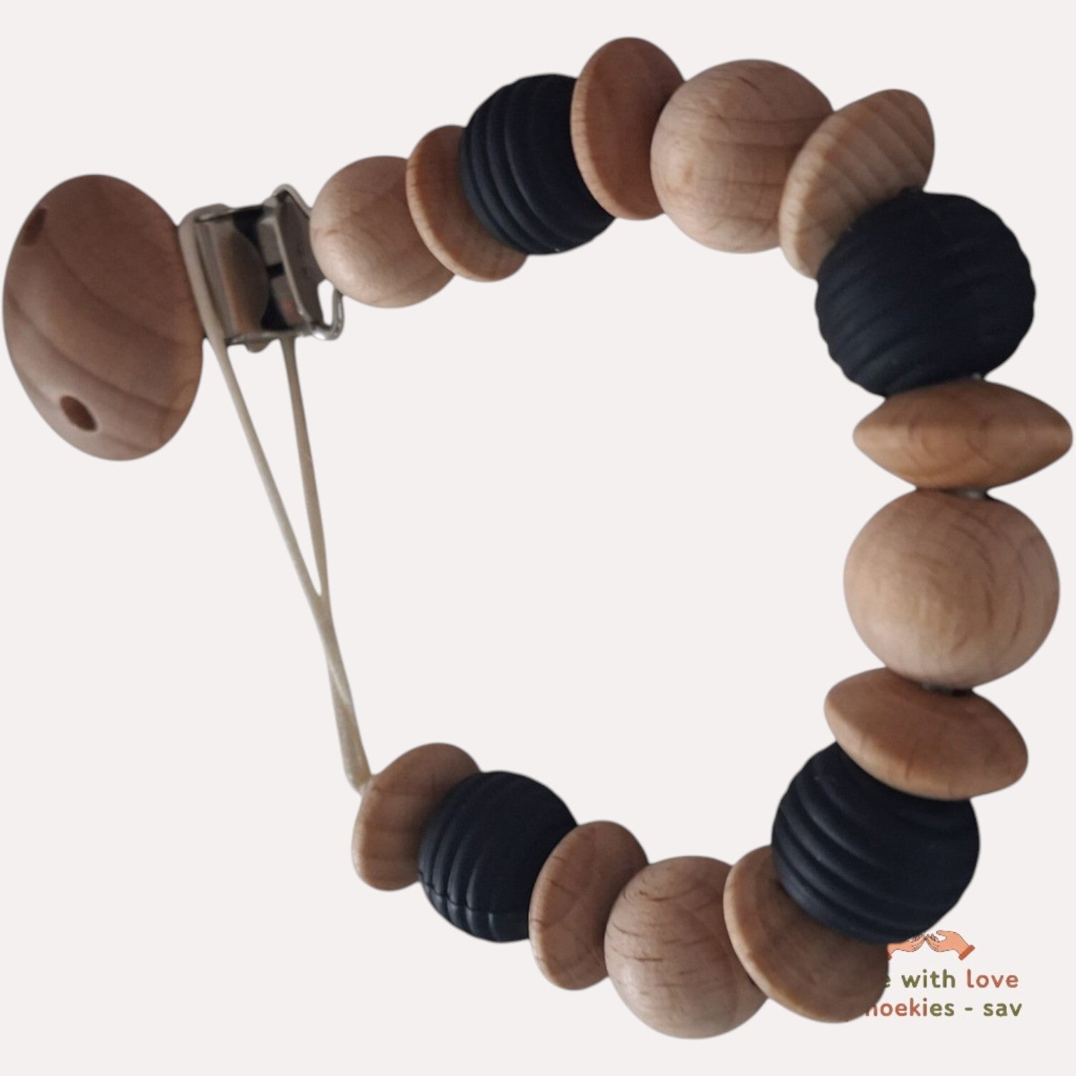 Handgemaakt. Thema hout ribbel. Speen koord met houten elementen en silleconen ballen, in de kleur zwart. Met deze speenkoord, raakt je kleintje zijn of haar speentje niet meer kwijt. De handige stevige klip is bedoeld voor aan de kledingstukken die je kind draagt, autostoelgordel, kinderwagen. Voor zowel thuis gebruik als voor onderweg. Totale lengte 28cm. Erg leuk om cadeau te geven. Niet geschikt als speelgoed of bijtring. Laat je kleintje nooit alleen ermee. Het speentje kan ook niet meer op de grond vallen. Speenkoorden mogen volgends NEN12586 veiligheidnorm, inclusief lus, zonder clip, maximaal 22 cm lang zijn. - Noekies .com kan niet aansprakelijk worden gesteld voor enige schade, letsel of ongelukken die voortvloeien uit het gebruik van dit speenkoord, zowel direct als indirect. Een speenkoord Is niet bedoeld om op te bijten. Het gebruik van een speenkoord is op eigen verantwoordelijkheid.