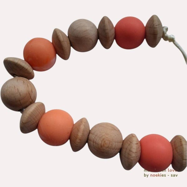 Handgemaakt. Thema hout ribbel. Speen koord met houten elementen en silleconen ballen, in de kleur pasteloranje. Met deze speenkoord, raakt je kleintje zijn of haar speentje niet meer kwijt. De handige stevige klip is bedoeld voor aan de kledingstukken die je kind draagt, autostoelgordel, kinderwagen. Voor zowel thuis gebruik als voor onderweg. Totale lengte 28cm. Erg leuk om cadeau te geven. Niet geschikt als speelgoed of bijtring. Laat je kleintje nooit alleen ermee. Het speentje kan ook niet meer op de grond vallen. Speenkoorden mogen volgends NEN12586 veiligheidnorm, inclusief lus, zonder clip, maximaal 22 cm lang zijn. - Noekies .com kan niet aansprakelijk worden gesteld voor enige schade, letsel of ongelukken die voortvloeien uit het gebruik van dit speenkoord, zowel direct als indirect. Een speenkoord Is niet bedoeld om op te bijten. Het gebruik van een speenkoord is op eigen verantwoordelijkheid.