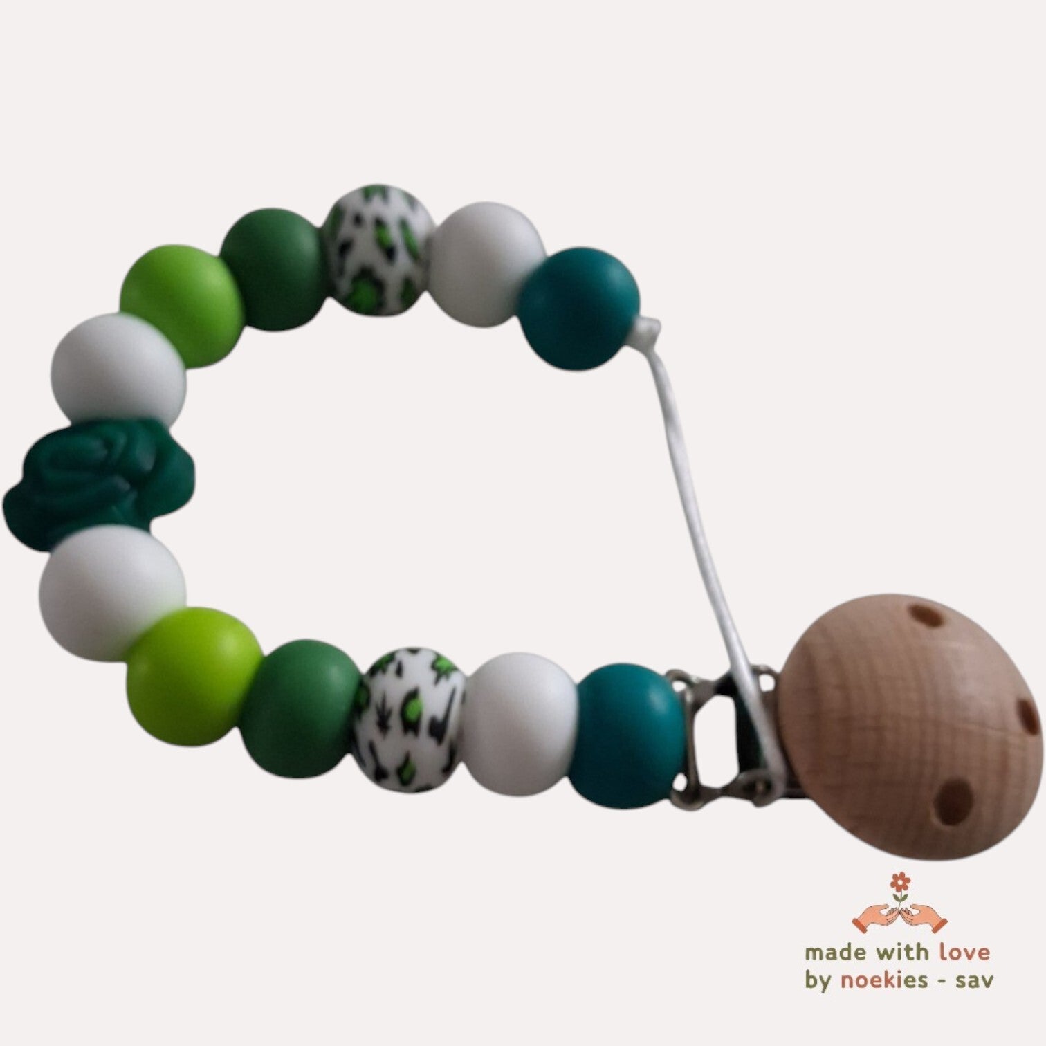 Handgemaakt. Thema roos. Speenkoord met roosje in de kleuren groen appelgroen en wit. Met deze speenkoord, raakt je kleintje zijn of haar speentje niet meer kwijt. De handige stevige klip is bedoeld voor aan de kledingstukken die je kind draagt, autostoelgordel, kinderwagen. Voor zowel thuis gebruik als voor onderweg. Totale lengte 28cm. Erg leuk om cadeau te geven. Niet geschikt als speelgoed of bijtring. Laat je kleintje nooit alleen ermee. Het speentje kan ook niet meer op de grond vallen. Speenkoorden mogen volgends NEN12586 veiligheidnorm, inclusief lus, zonder clip, maximaal 22 cm lang zijn. - Noekies .com kan niet aansprakelijk worden gesteld voor enige schade, letsel of ongelukken die voortvloeien uit het gebruik van dit speenkoord, zowel direct als indirect. Een speenkoord Is niet bedoeld om op te bijten. Het gebruik van een speenkoord is op eigen verantwoordelijkheid.