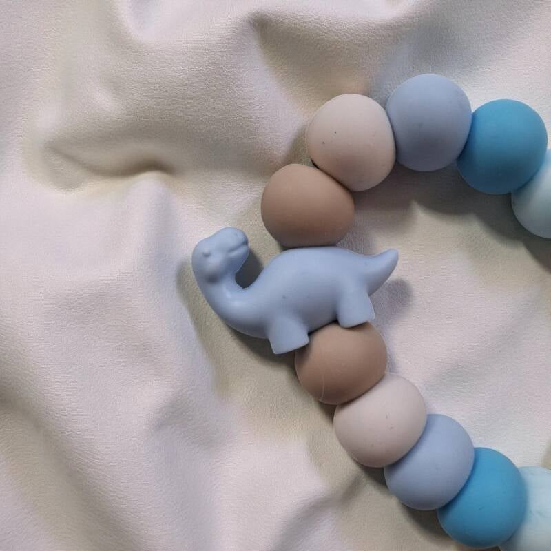 Handgemaakt Nooit meer het favoriete speentje kwijtraken door zo'n handig speenkoord. De siliconen kralen van deze speenkoord zijn een mix van lichtblauw, beige, met lichtblauwe Dino. De kralen zijn volledig BPA-vrij, PVC-vrij, lood-vrij en ftalaat-vrij. De handige stevige klip is bedoeld voor aan de kledingstukken die je kind draagt, autostoelgordel, kinderwagen. Voor zowel thuis gebruik als voor onderweg. Erg leuk om cadeau te geven. Niet geschikt als speelgoed of bijtring. Laat je kleintje nooit alleen ermee. Het speentje kan ook niet meer op de grond vallen. Speenkoorden mogen volgends NEN12586 veiligheidnorm, inclusief lus, zonder clip, maximaal 22 cm lang zijn. - Noekies .com kan niet aansprakelijk worden gesteld voor enige schade, letsel of ongelukken die voortvloeien uit het gebruik van dit speenkoord, zowel direct als indirect. Een speenkoord Is niet bedoeld om op te bijten. Het gebruik van een speenkoord is op eigen verantwoordelijkheid.
