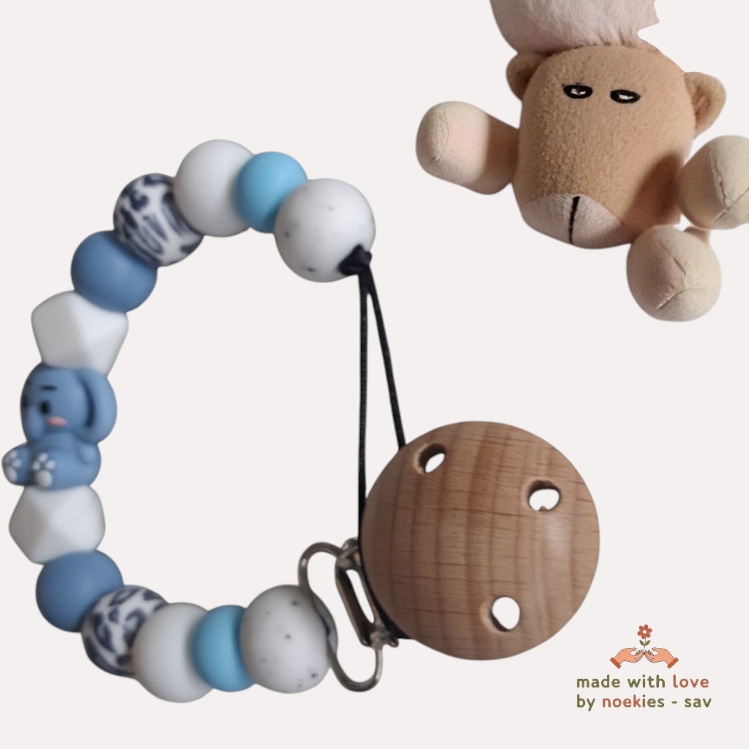 Speen koord met blauw olifantje, overige kleuren wit blauw grijs. Met deze speenkoord, raakt je kleintje zijn of haar speentje niet meer kwijt. De handige stevige klip is bedoeld voor aan de kledingstukken die je kind draagt, autostoelgordel, kinderwagen. Voor zowel thuis gebruik als voor onderweg. Totale lengte 28cm. Erg leuk om cadeau te geven. Niet geschikt als speelgoed of bijtring. Laat je kleintje nooit alleen ermee. Het speentje kan ook niet meer op de grond vallen. Speenkoorden mogen volgends NEN12586 veiligheidnorm, inclusief lus, zonder clip, maximaal 22 cm lang zijn. - Noekies .com kan niet aansprakelijk worden gesteld voor enige schade, letsel of ongelukken die voortvloeien uit het gebruik van dit speenkoord, zowel direct als indirect. Een speenkoord Is niet bedoeld om op te bijten. Het gebruik van een speenkoord is op eigen verantwoordelijkheid.