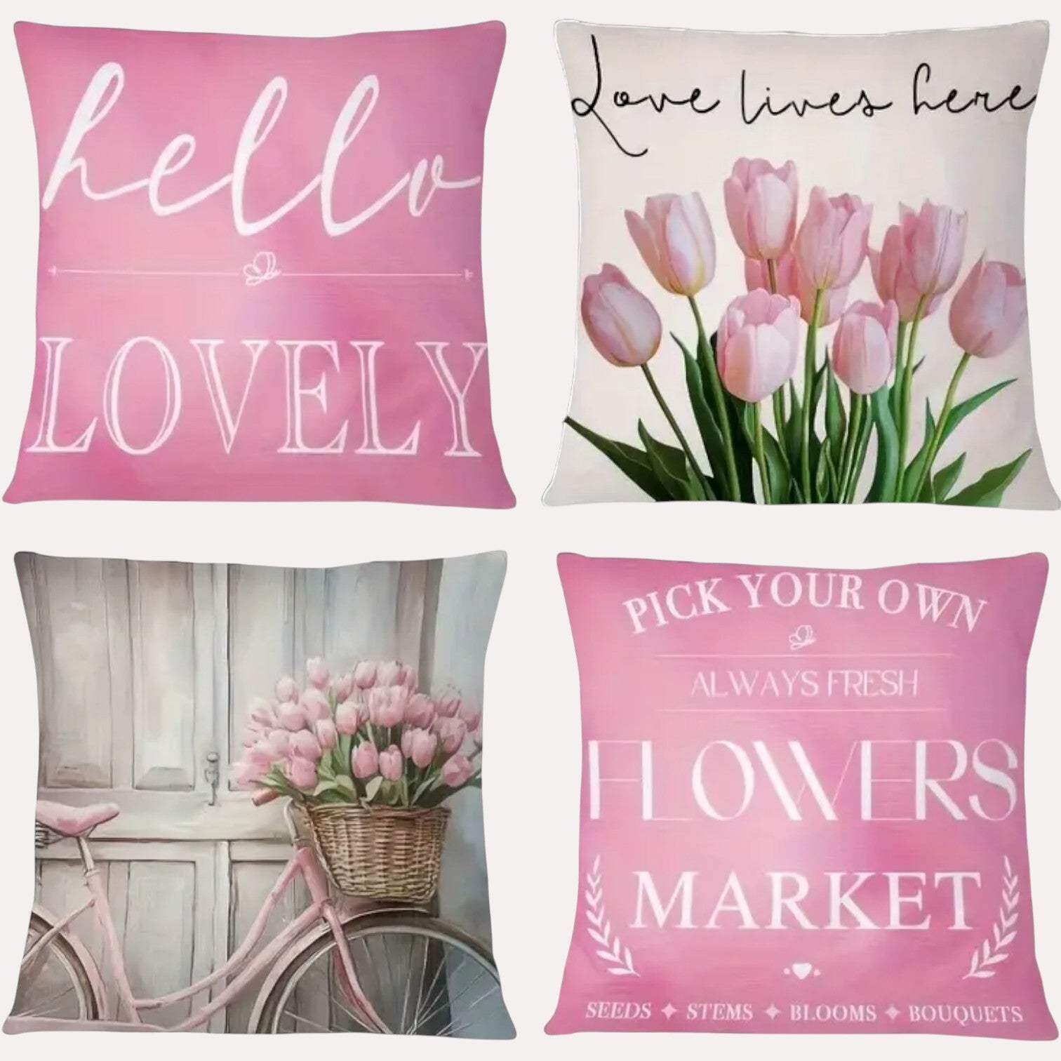 Set van 4 kussenhoezen tulp en fiets lichtroze groen 45x45cm