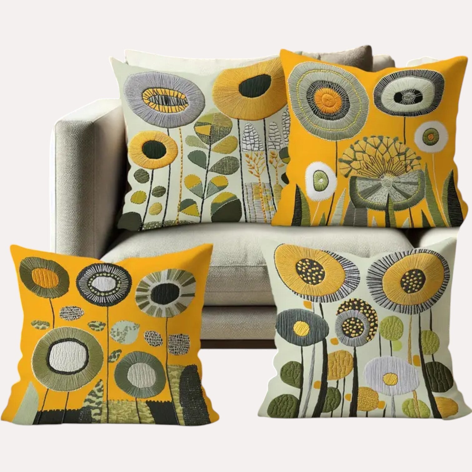 Mooie kussenhoezen met bloemenprint in mosterdgeel en donkergroene kleurtjes, met bloemen patoon. U ontvangt 4 stuks. De achterzijde van de kussenhoes is effen wit. De kussenhoezen worden zonder kussenvulling geleverd. De kussenhoezen zijn machinewasbaar en hebben en ritssluiting. Afmetingen 40cm x 40cm. 100% polyester.