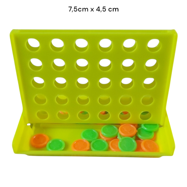 Bekijk de afmetingen, mini formaat! Leuk om te trakteren. kleuren geel met groen oranje fiches. afmetingen 7,5cm x 4,5cm. Beleef onderweg eindeloos plezier met 4 op een rij, mini formaat reiseditie! Of je nu op pad bent met vrienden of familie, geniet van een spelletje, deze compacte versie van het klassieke 4-op-een-rij-spel is speciaal ontworpen voor onderweg. Het lichte en draagbare ontwerp zorgt ervoor dat je het gemakkelijk kunt meenemen, of het nu op vakantie is, tijdens een roadtrip of gewoon naar het park of lekker op het strand. Laat je strategisch inzicht spreken terwijl je de speelstenen in het frame laat vallen en probeer als eerste vier van jouw stenen horizontaal, verticaal of diagonaal op een rij te krijgen. Het is een spel dat gemakkelijk te leren is, maar moeilijk te beheersen, en het zorgt voor uren speelplezier.