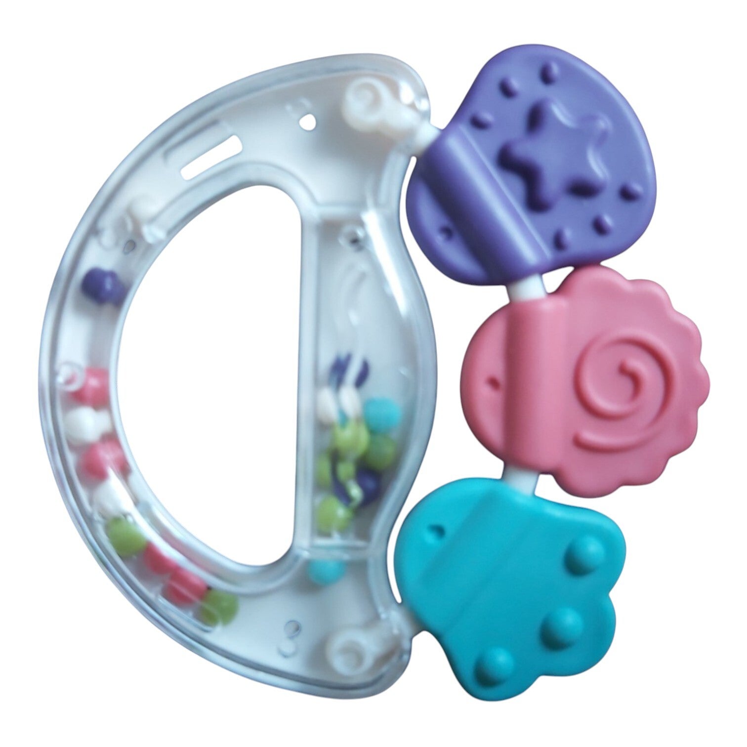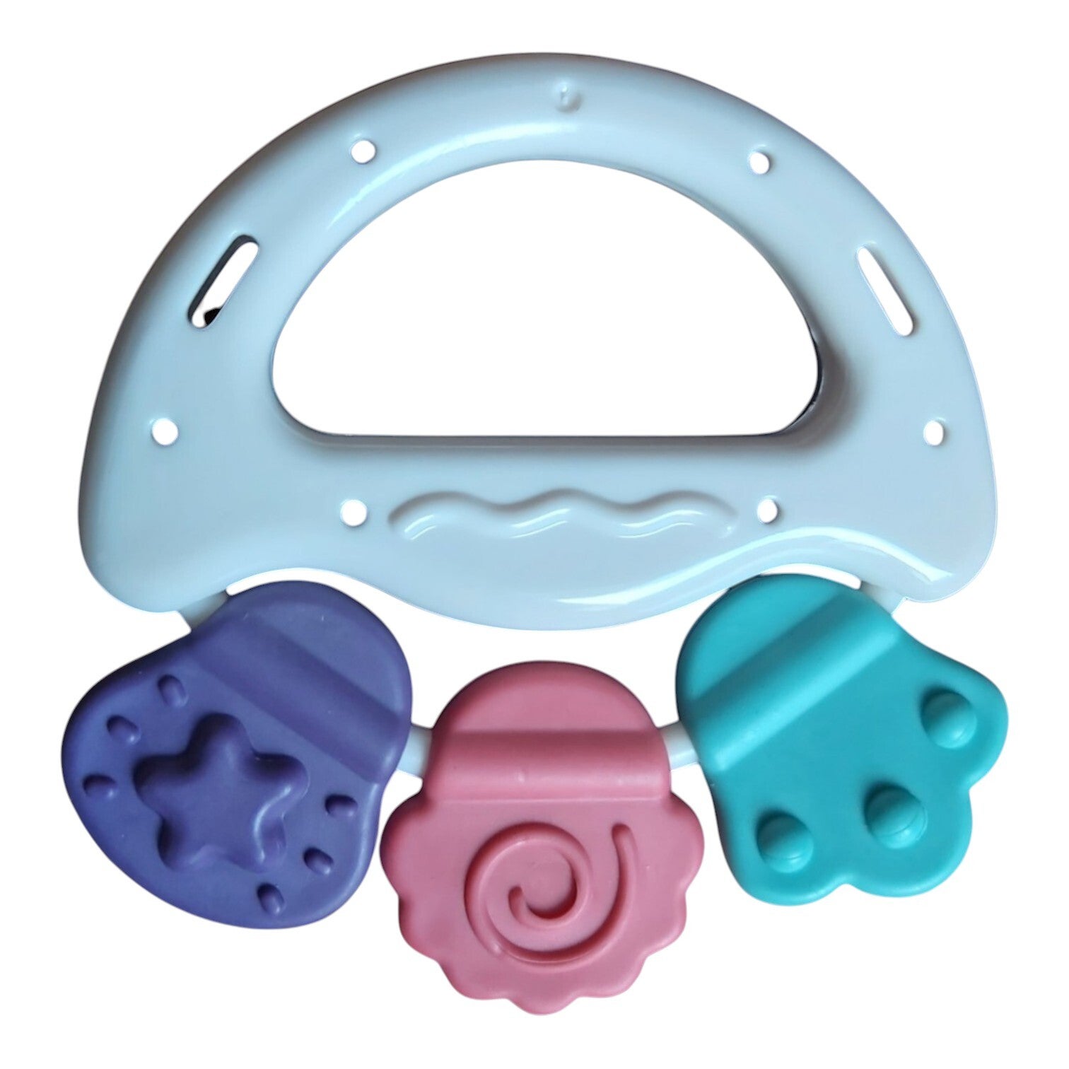 Bijtring rammelaar met beweging aan de 3 items. Wanneer je baby tandjes krijgt, zorgt dit vaak voor ongemak. Een bijtring kan de pijn van doorkomende tanden verminderen. Op deze soliconen bijtring kan je kindje kan bijten. Ze zijn zo ontworpen dat je baby dit veilig kan doen, zonder zijn of haar mond of het speelgoed te beschadigen. Het bijten verlicht de pijn van doorkomende tandjes. De eerste tandjes komen meestal door als je baby tussen de 4 en 7 maanden oud is. Dit zorgt vaak voor ongemak en pijn aan het tandvlees van je kindje. Het is een nieuw en onprettig gevoel waaraan hij moet wennen. Sabbelen en bijten op een bijtring kan hem of haar hierbij helpen. De tegendruk die dit op zijn tandvlees geeft, verlicht de pijn. Ook kan een bijtring ervoor zorgen dat de tanden sneller doorkomen. Op veel bijtringen zitten bobbels of noppen. Deze masseren het tandvlees van je baby als hij hierop bijt. Dat is extra fijn voor je kindje. En omdat een bijtring vaak een leuke kleur of vorm heeft, kan hij er tegelijkertijd fijn mee spelen. En heeft de afmeting van 10x10cm. Kleur creme meerkleurig,