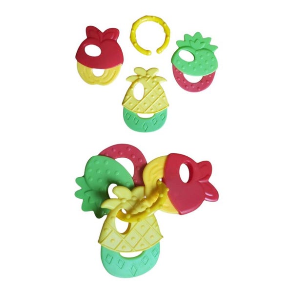 Wanneer je baby tandjes krijgt, zorgt dit vaak voor ongemak. Een bijtring kan de pijn van doorkomende tanden verminderen. Op deze soliconen bijtring kan je kindje kan bijten. Ze zijn zo ontworpen dat je baby dit veilig kan doen, zonder zijn of haar mond of het speelgoed te beschadigen. Het bijten verlicht de pijn van doorkomende tandjes. De eerste tandjes komen meestal door als je baby tussen de 4 en 7 maanden oud is. Dit zorgt vaak voor ongemak en pijn aan het tandvlees van je kindje. Het is een nieuw en onprettig gevoel waaraan hij moet wennen. Sabbelen en bijten op een bijtring kan hem of haar hierbij helpen. De tegendruk die dit op zijn tandvlees geeft, verlicht de pijn. Ook kan een bijtring ervoor zorgen dat de tanden sneller doorkomen. Op veel bijtringen zitten bobbels of noppen. Deze masseren het tandvlees van je baby als hij hierop bijt. Dat is extra fijn voor je kindje. En omdat een bijtring vaak een leuke kleur of vorm heeft, kan hij er tegelijkertijd fijn mee spelen. Deze bijtring kan in een pan heet water uitgekookt worden, zoals u ook met fles spenen doet. En heeft de afmeting van 8.2cm. Kleur meerkleurig. thema ananas.