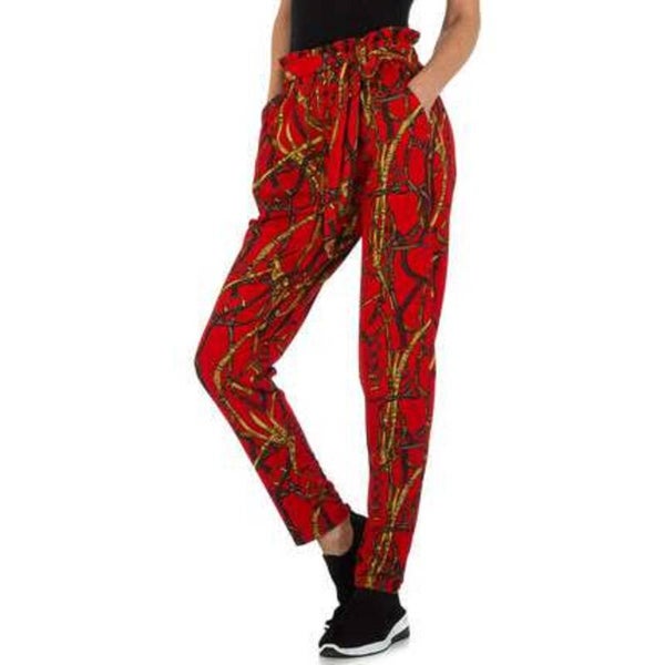 Comfortable broek elastische taille sierstrik insteekzakken riempjes print kleuren rood goud zwart 85% polamide 15% elasthan maat S/M afmetingen plat gemeten: lengte 98cm taille elastisch 34-53cm heupen 50cm. merk: Fashion Design. gewicht 255gram.