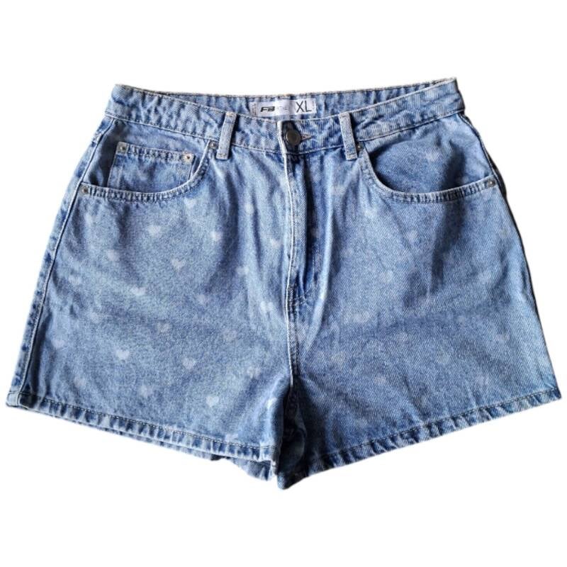 Weinig gedragen. Korte spijkbroek met hartjes en insteekzakken aan de voorkant. Kontzakken, rits en knoop sluiting. Maat XL afmetingen plat gemeten: taille 41cm heup 55.5cm lengte 34cm. merk FB Sister