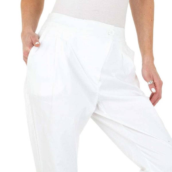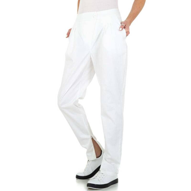Broek lossere pasvorm met verborgen ritssluitingen aan de broekspijpen, insteekzakken, knoopssluiting, hoge taille. kleur wit gemaakt van 97% katoen, 3% elastaan. maat L afmetingen plat gemeten taille 39cm heup 52-58cm lengte 103cm
