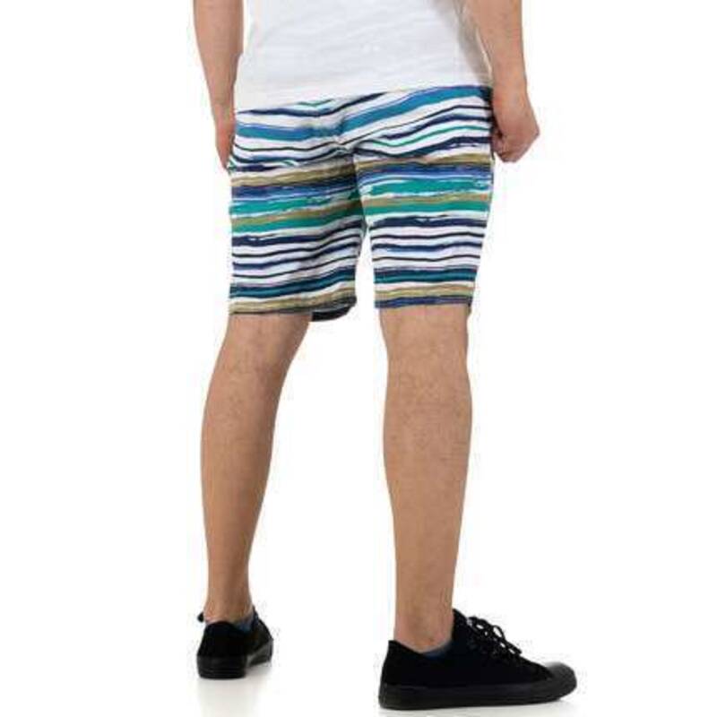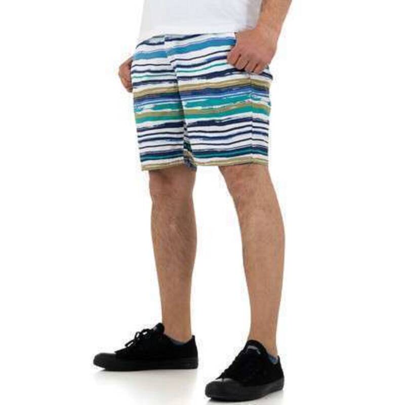 Korte broek in horizontale streep patroon is in de kleuren groen lichtblauw wit zwart. Deze broek heeft een knoops en rits sluiting en riemlussen waardoor deze ook met riem gedragen kan worden. Deze korte broek valt net boven kniehoogte , heeft insteek broekzakken. 100% katoen. maat W29 / F38 afmetingen plat gemeten taille 35cm heup 47cm lengte 46cm