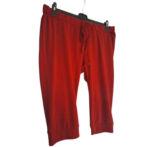 Weinig gedragen. Capri broek met elastische tailleband. Deze broek valt net onder de knie. Kleur wijnrood. Materiaal 95% polyeter 5% sandex. Maat 2XL