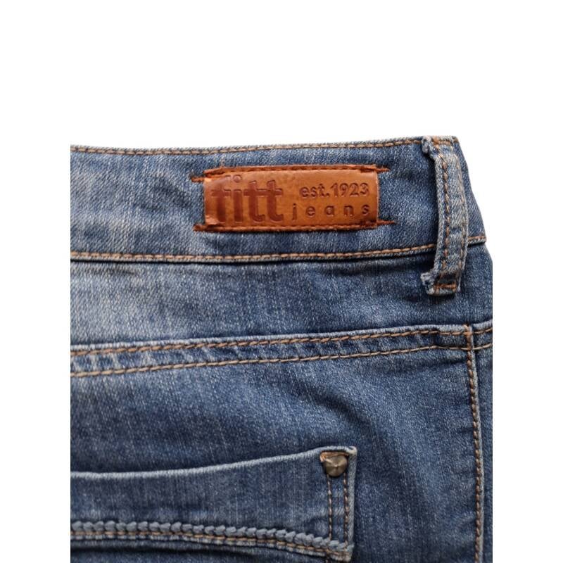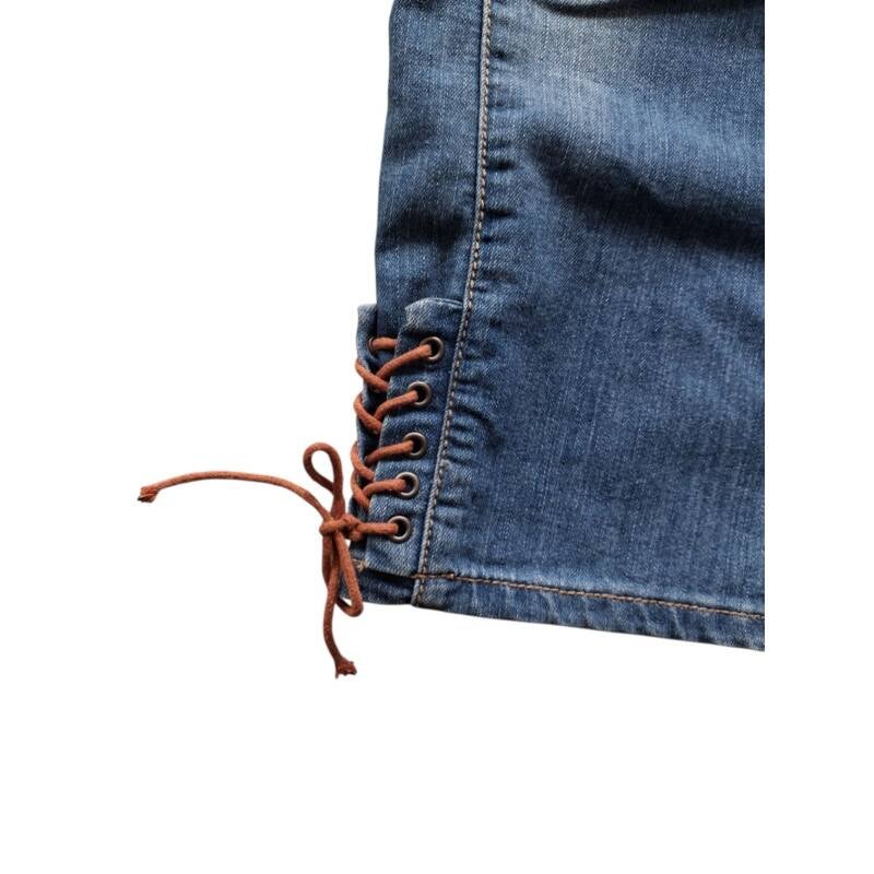 Spijkerbroek driekwart lang met veterwerk. Van het merk fitt maat 4XL/48 afmetingen plat gemeten taille 58cm heup 66cm lengte 81cm.